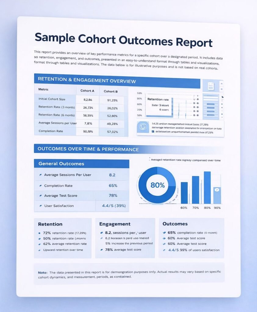 Skill growth, engagement, confidence, readiness, and cohort-level trends, reported in aggregate to support decision-making and scaling.